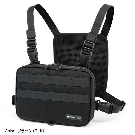 本体フロントには、用途に応じて自由にポーチなどをレイアウトし収納機能を拡張できる、アクセサリーアタッチメント対応レールテープが付いています。ショルダーテープについている調節ループ(特許取得済)で、バッグのポジション変更ができます。