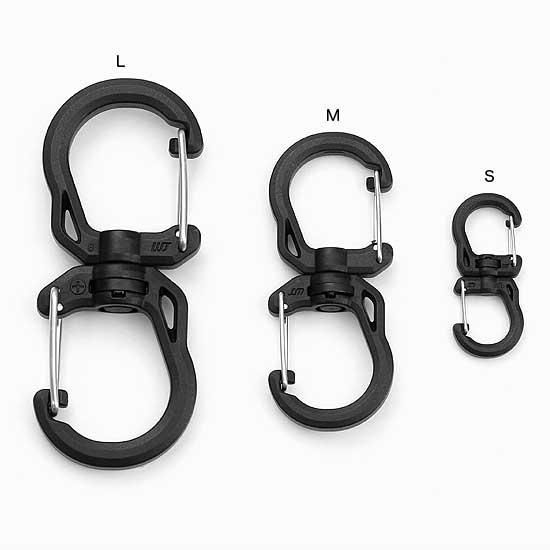 SPIN HOOK(スピンフック)は樹脂製のS字カラビナです。S字の両端が独立したフックになっており、バッグやベルトなどに掛ける側と物を掛ける側が分けられるので、脱着時の煩わしさが無く便利です。また、両端が中央部で360度回転します。