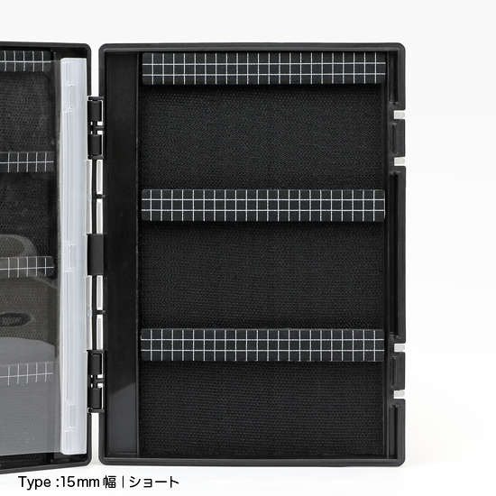裏面に面ファスナー(メス面)がついており、ボックスの任意の位置にレイアウトできます。DM10Sにマイクロスプーン、DM15Sに小・中型スプーンをセットするなど10mmと15mmを組み合わせ、戦略的なレイアウトを作ることもできます。